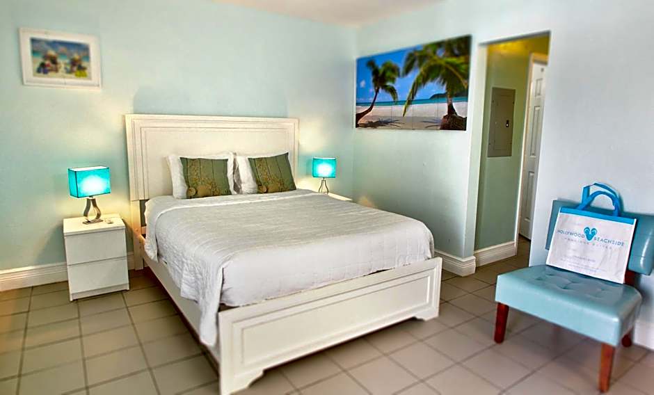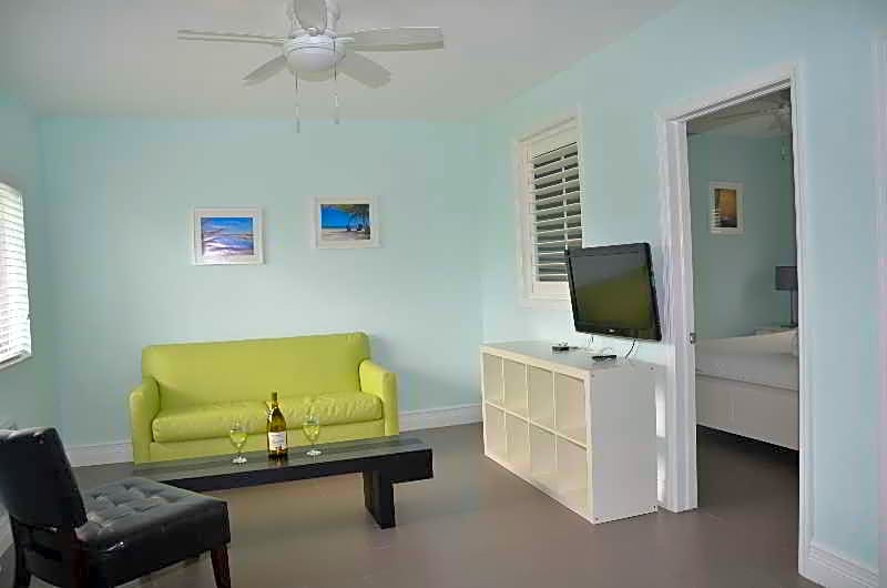 This room features a separate living area with a flat-screen TV and a kitchenette, complete with a stove top, microwave, and refrigerator.
